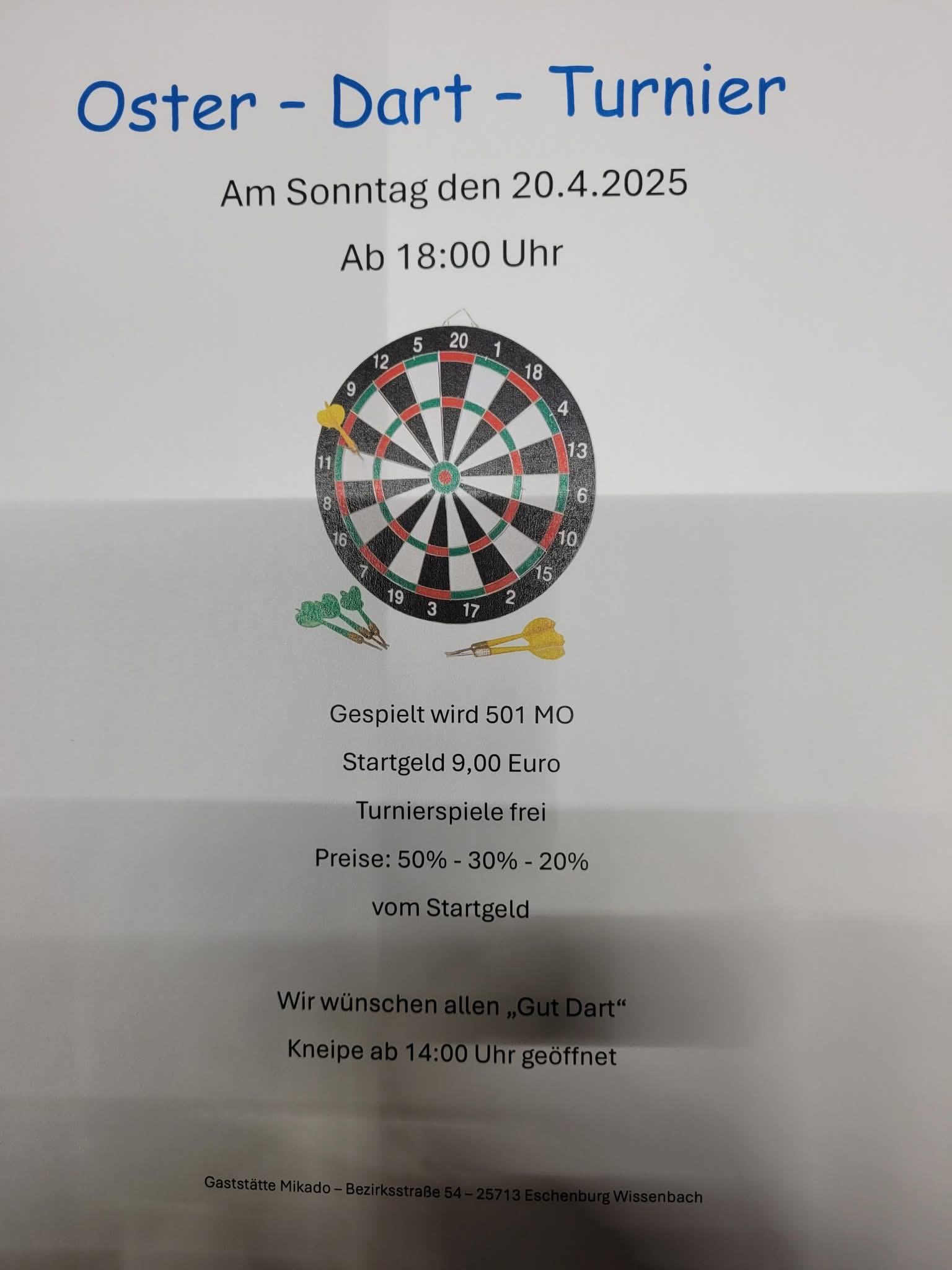 Am 20.04.26 findet am Ostersonntag den 20.04.26 ein E-Dart Turnier statt.